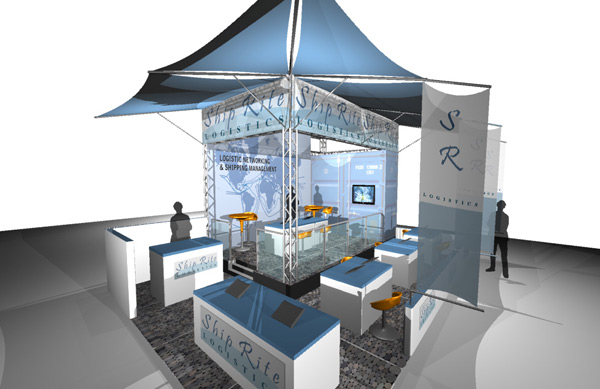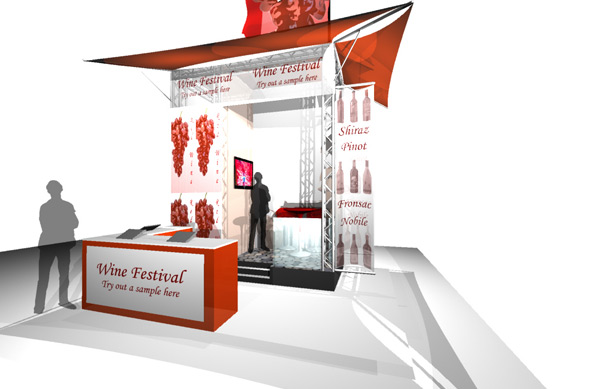 Our Mezzo Pavilion is based on a typical 6m x 4m stand area. Although it is very compact it still includes the zones one would expect for complete customer experience: registering, greeting, interactive display, product display, video, digital and online apps, a raised, more private area and seating and meeting areas. The banners and ceiling material not only provide colourful branding opportunities but also provide a reassuring canopy over the environment.